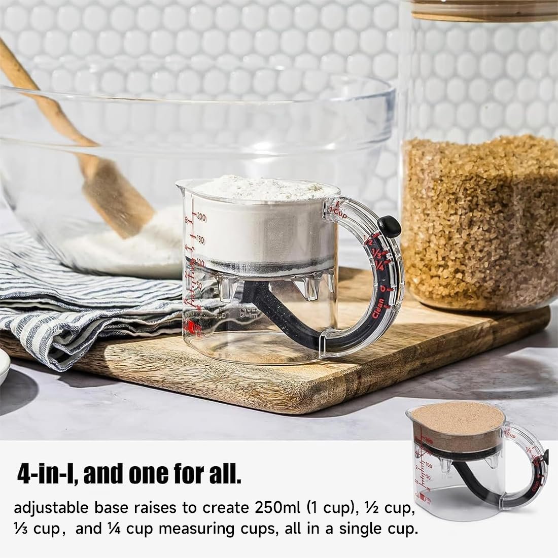 - 4-in-1 Design: This integrated, adjustable measuring cup replaces multiple measuring cups, saving kitchen space