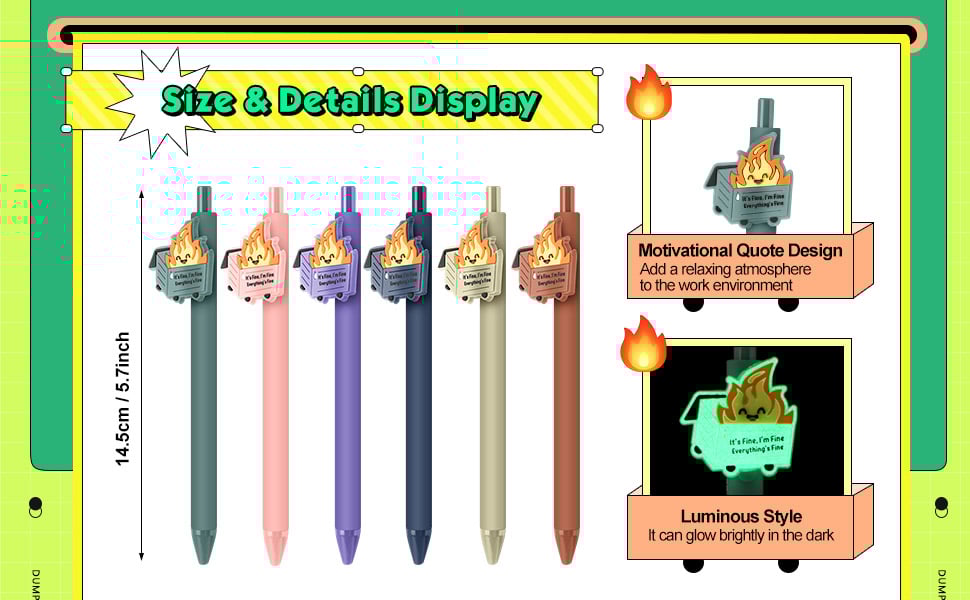 - Abundant and Amusing Packaging: our pack of 6/12/18 dumpster fire motivational pens bulk offers you an interesting and zestful writing tool; These ballpoint pens with funny sayings for adults are full of vivid and luminous colors, and the dumpster fire decoration on top of the pen can glow in the dark, making them ideal employee appreciation gifts or serves as a fun addition to your home or office